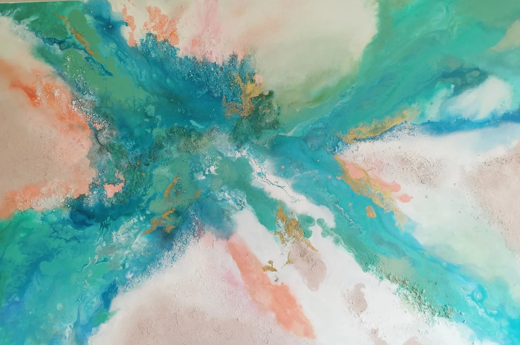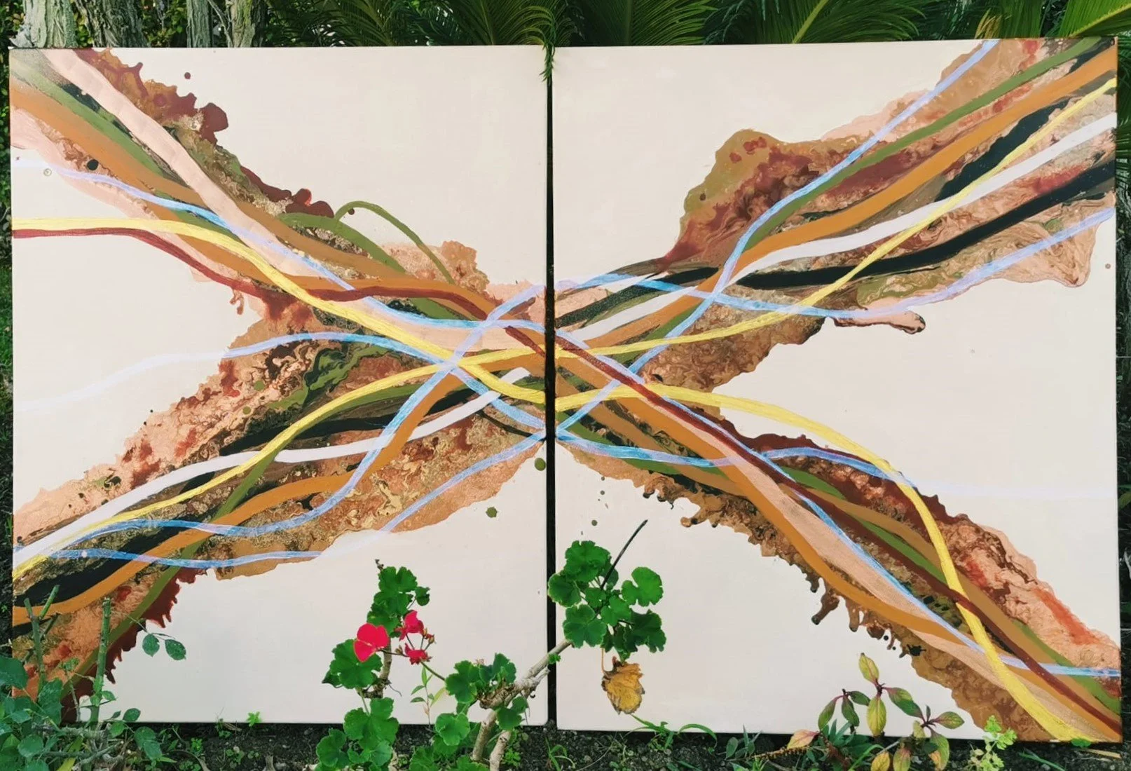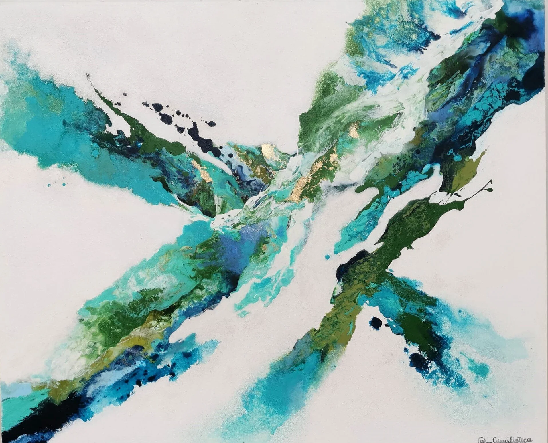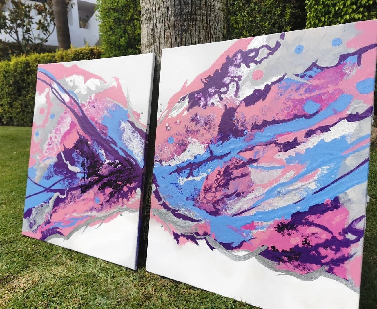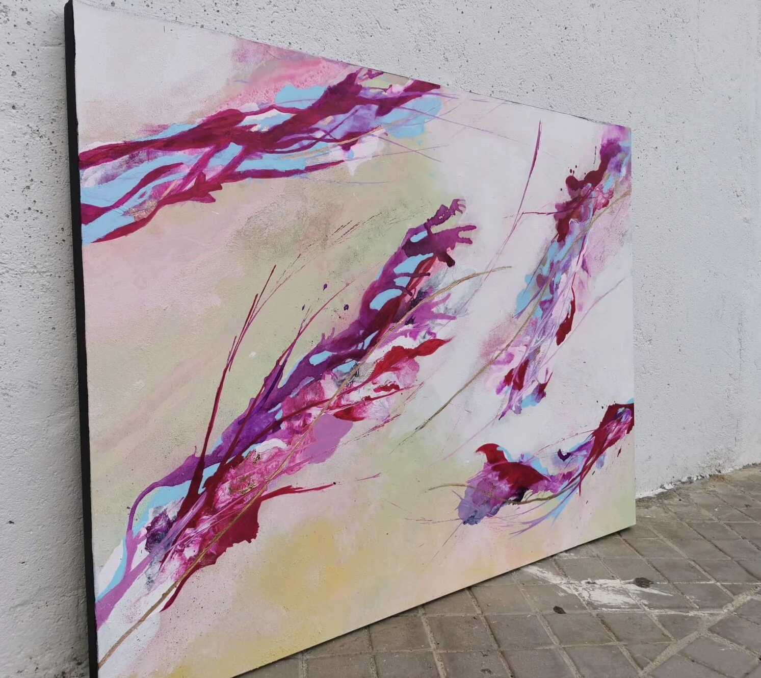 En esta serie que trabajo sobre madera; quiero expresarme con la libertad que me sugiere la fluidez de la pintura. De forma intuitiva, con trazos y manchas espontáneas pretendo que al mirarla tengas la sensación de vuelo y de la ligereza de una pluma en el viento.